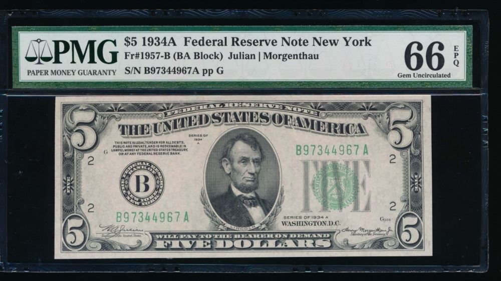 One 1934A $5 New York Federal Reserve Note PMG 66EPQ.