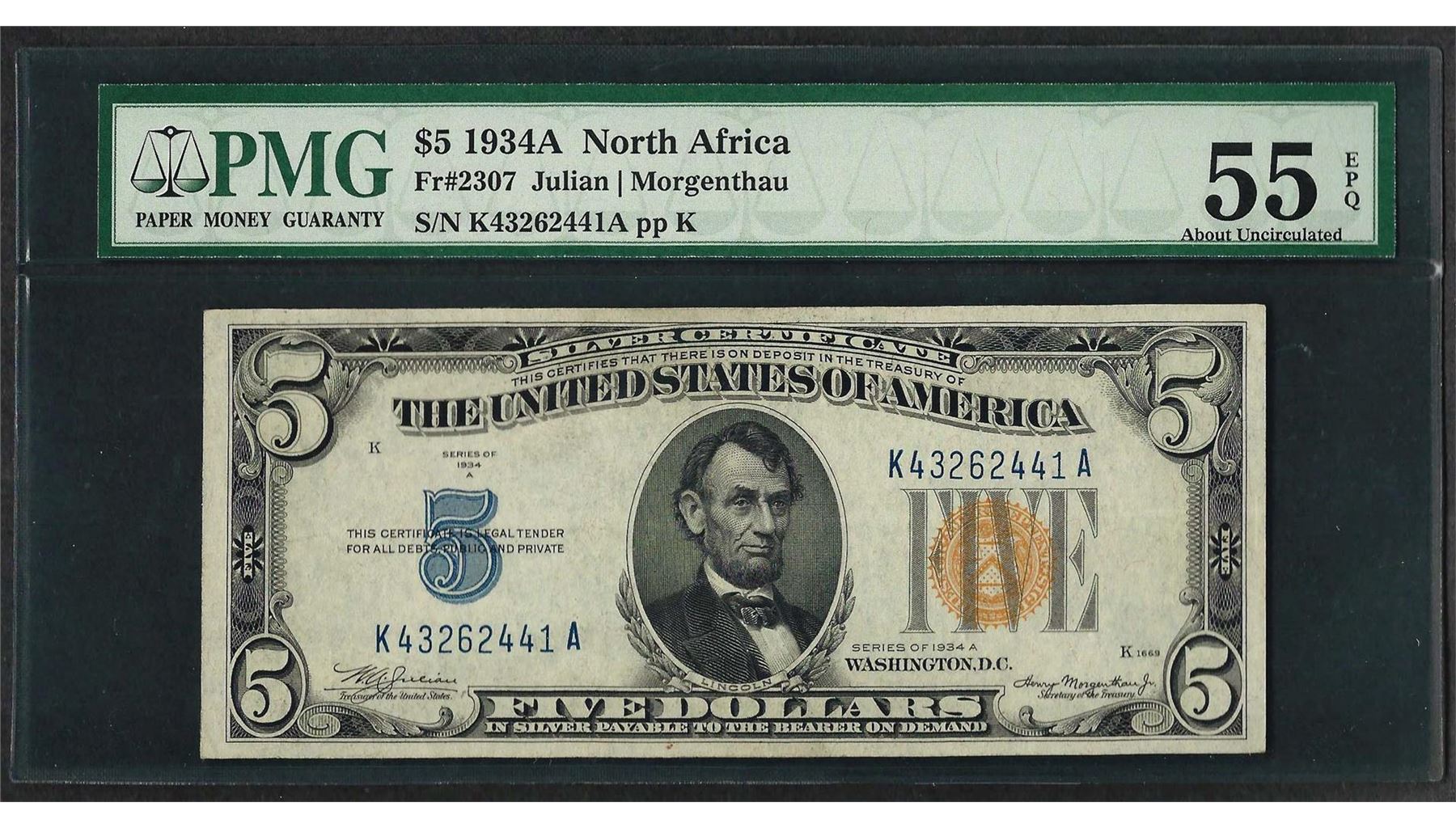 One 1934A $5 North Africa Silver Certificate WWII Emergency Note PMG About Unc. 55EPQ. PMG Certified.
