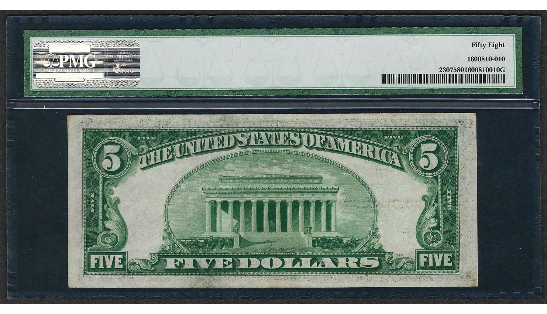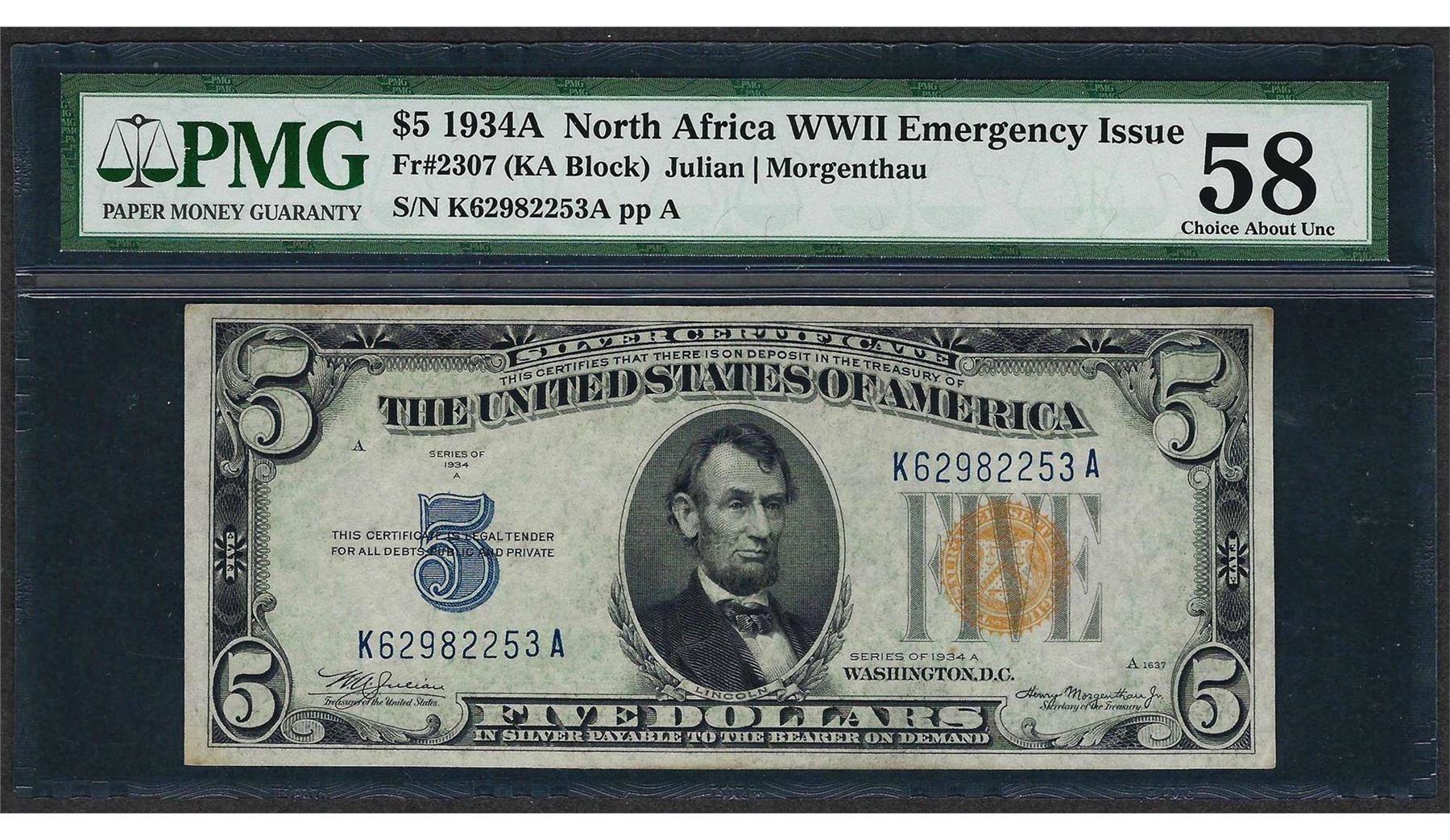 One 1934A $5 North Africa Silver Certificate WWII Emergency Note PMG Choice About Unc 58. PMG Certified.