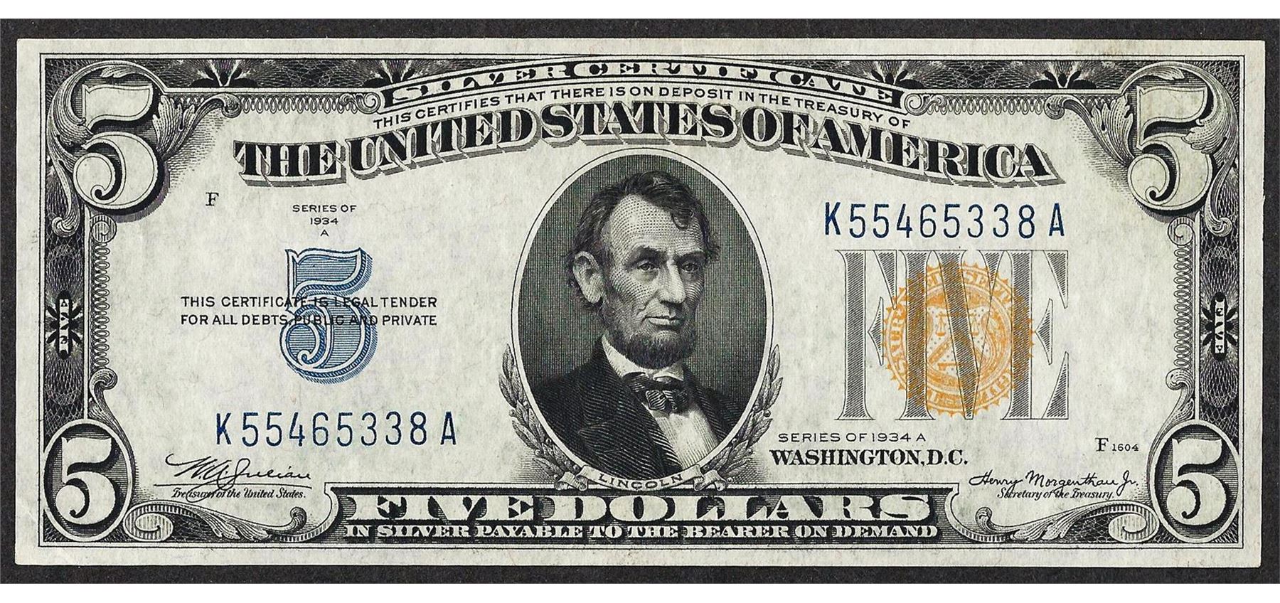 One 1934A $5 North Africa WWII Emergency Issue Silver Certificate Note.
