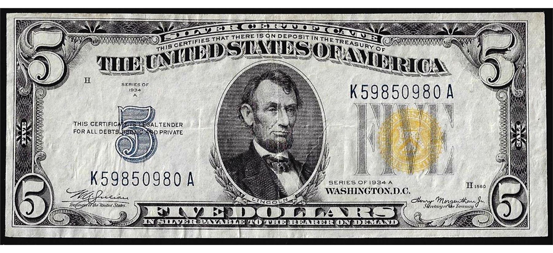 One 1934A $5 North Africa WWII Emergency Issue Silver Certificate Note.