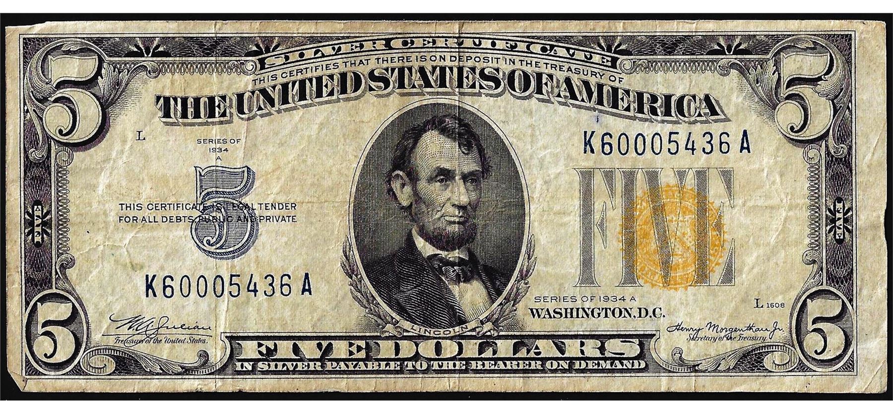 One 1934A $5 North Africa WWII Emergency Issue Silver Certificate Note.