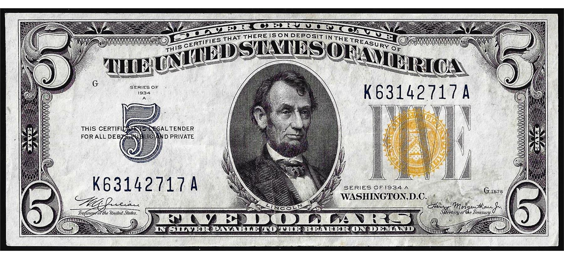 One 1934A $5 North Africa WWII Emergency Issue Silver Certificate Note.