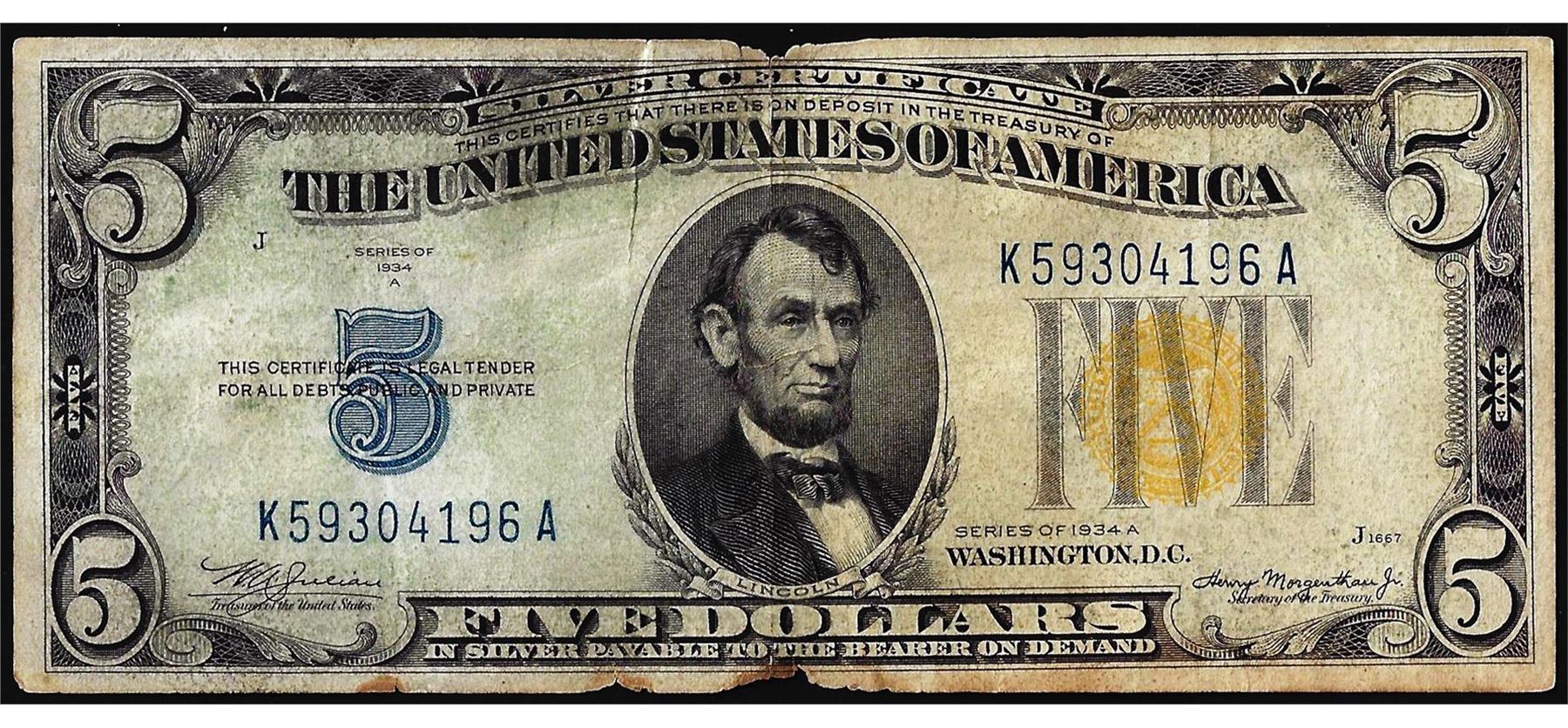 One 1934A $5 North Africa WWII Emergency Issue Silver Certificate Note.