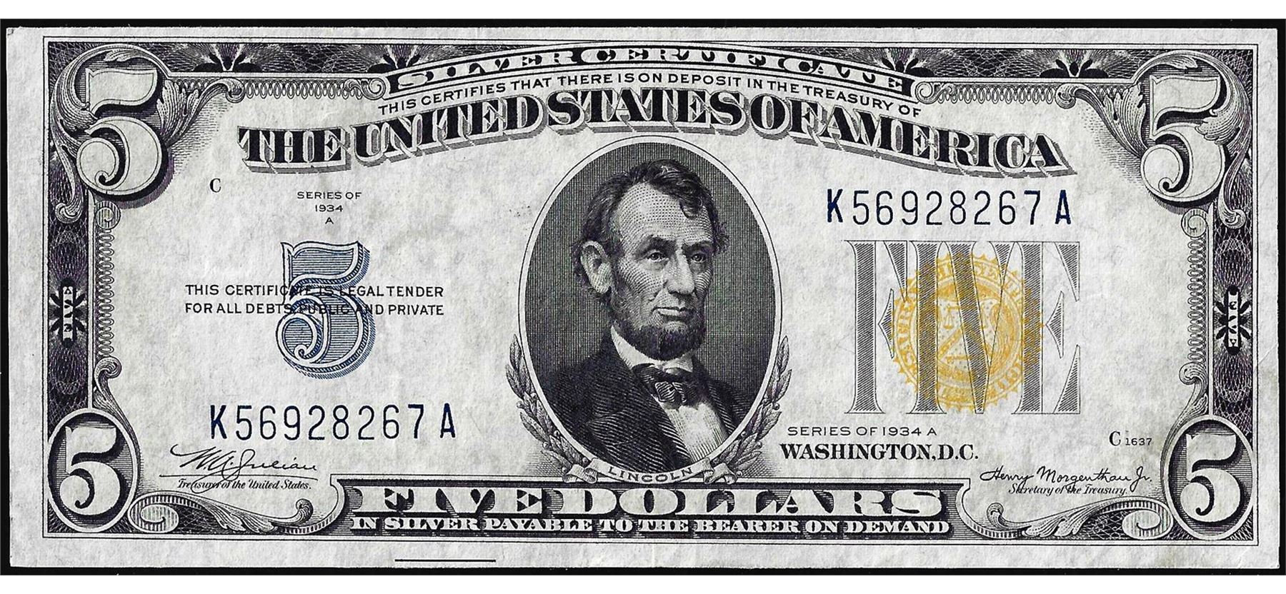One 1934A $5 North Africa WWII Emergency Issue Silver Certificate Note.