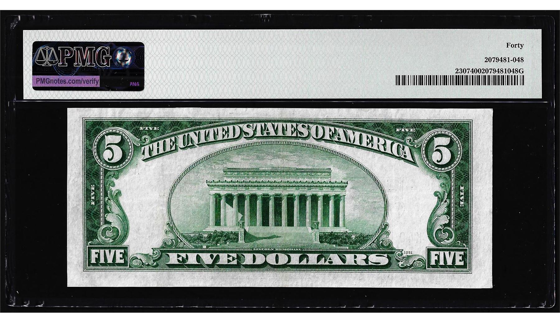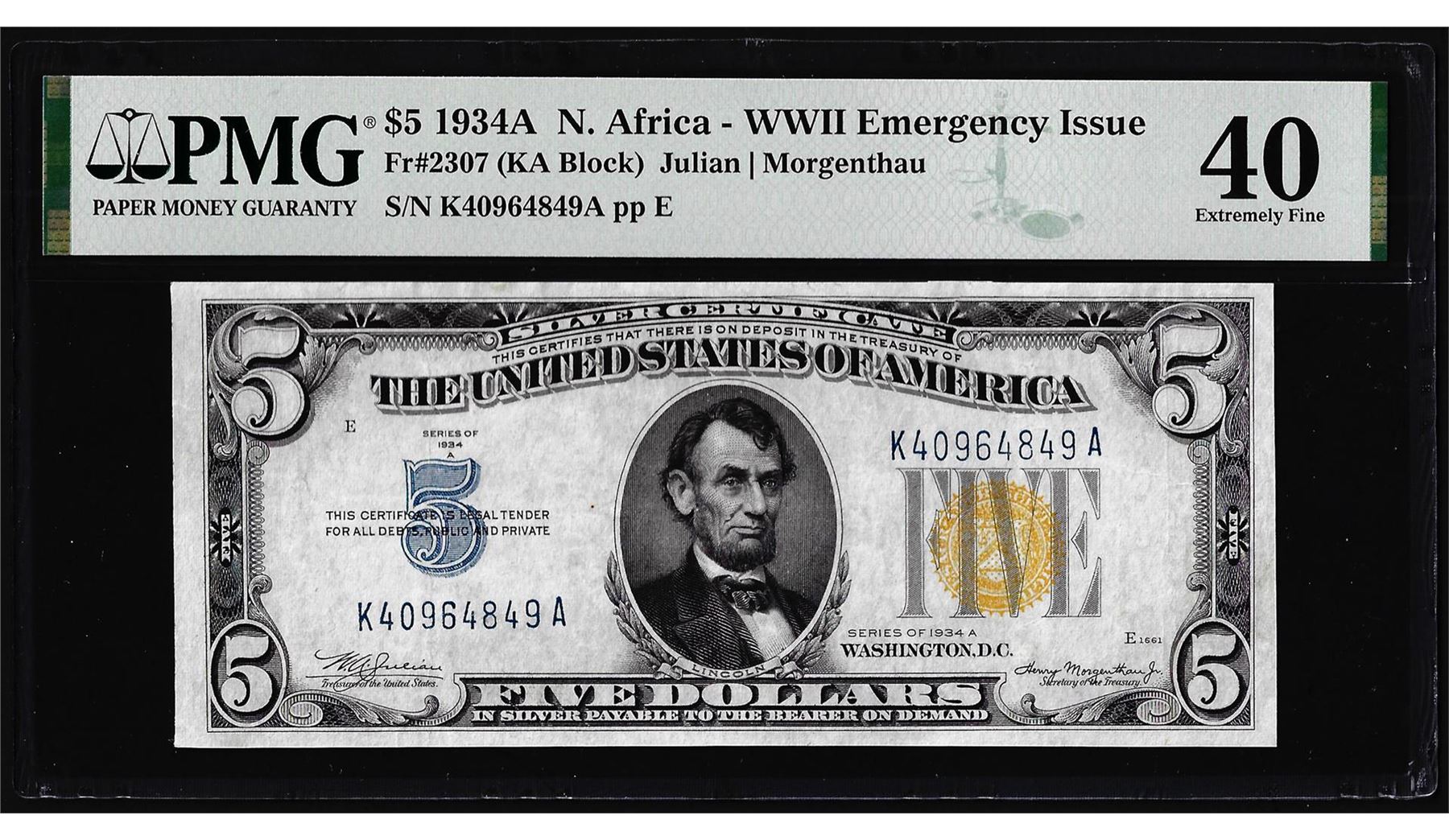 One 1934A $5 North Africa WWII Emergency Silver Certificate Note PMG Extremely Fine 40. PMG Certified.