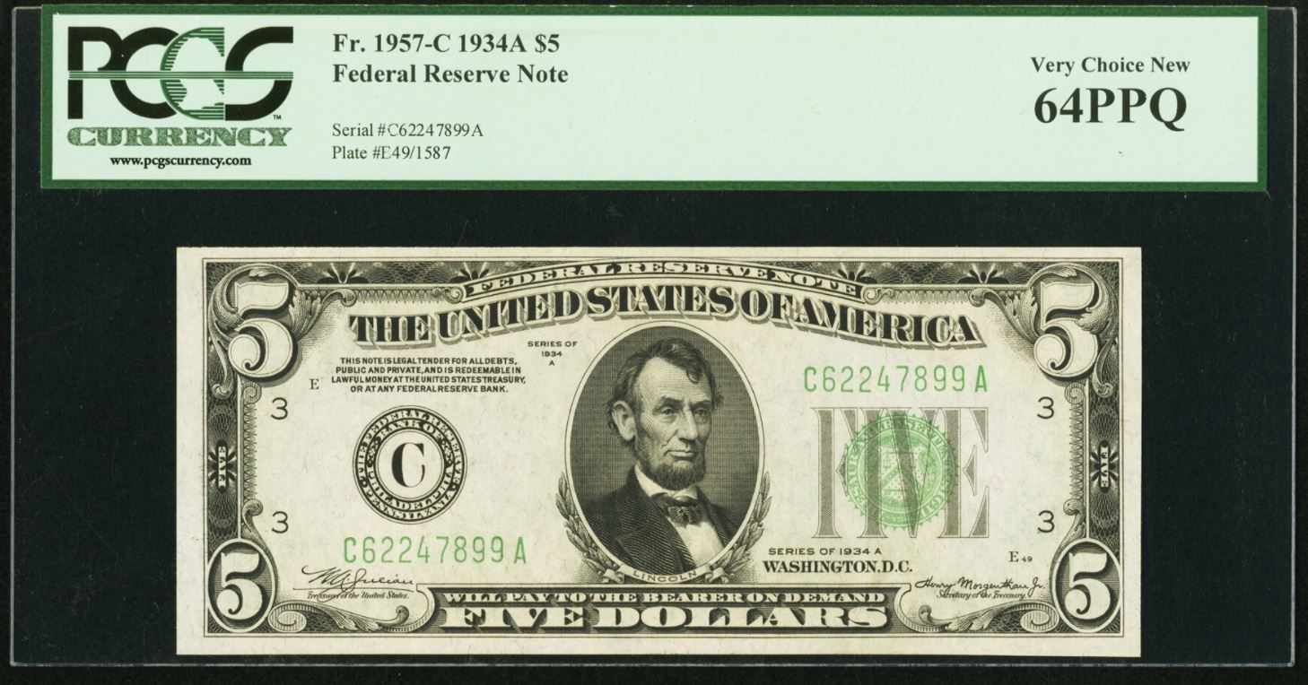 One 1934A $5 Philadelphia Federal Reserve Note PCGS 64PPQ.