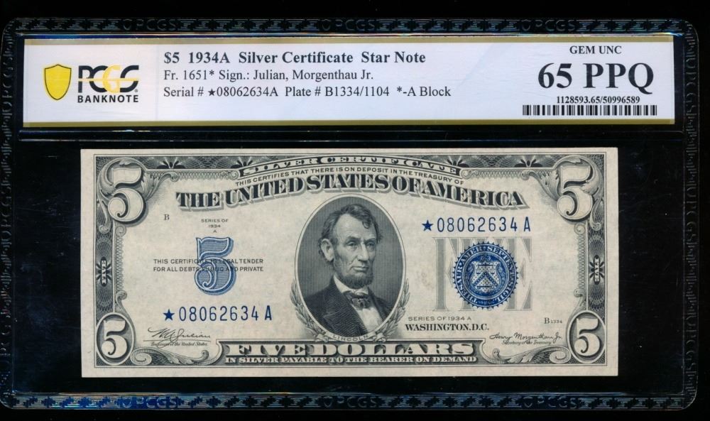 One 1934A $5 STAR Silver Certificate PCGS 65PPQ.