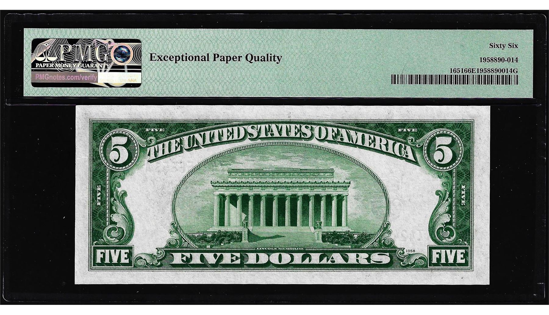 One 1934A $5 Silver Certificate Note Fr.1651 PMG Gem Uncirculated 66EPQ. PMG Certified.