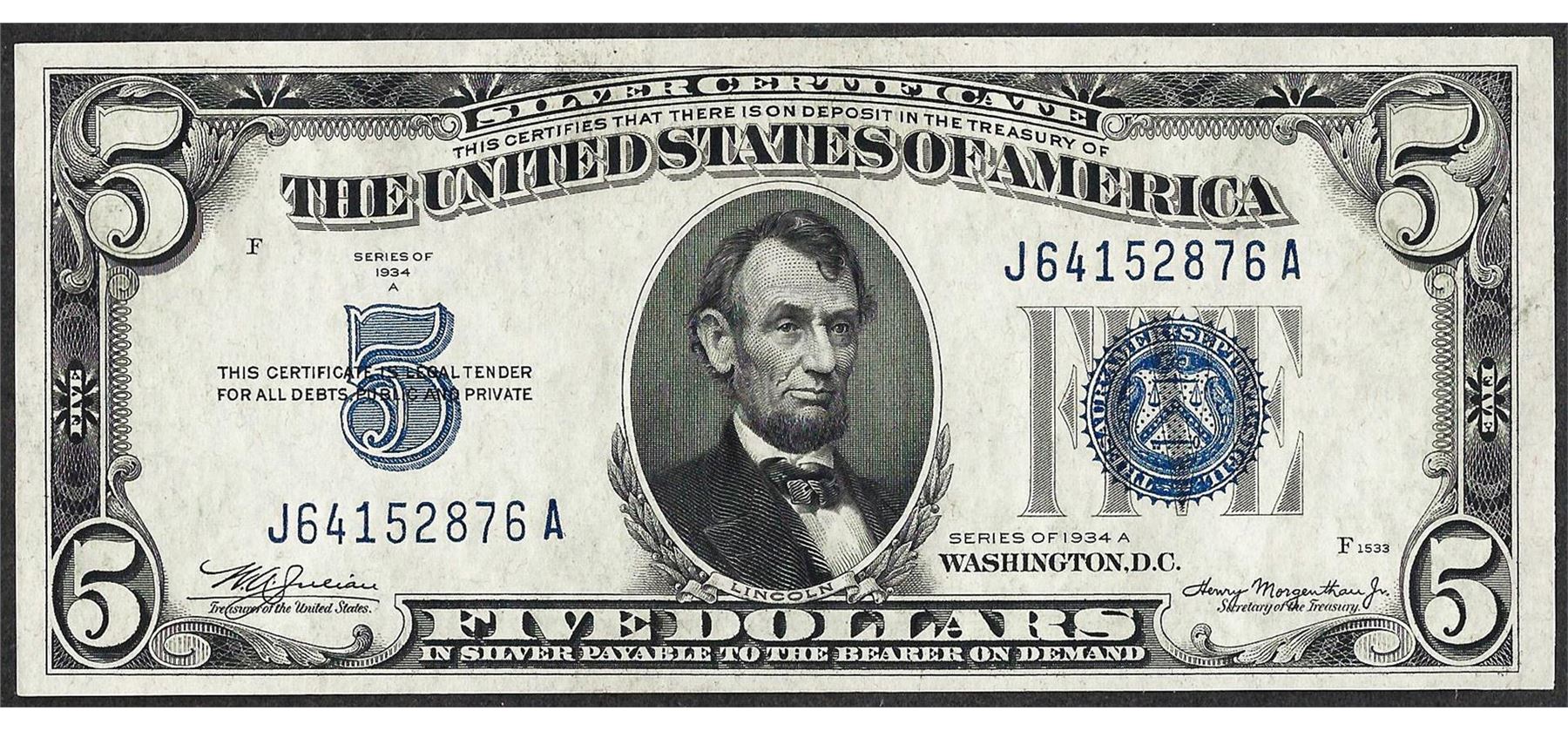 One 1934A $5 Silver Certificate Note.