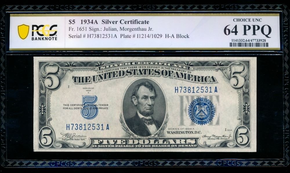 One 1934A $5 Silver Certificate PCGS 64PPQ.