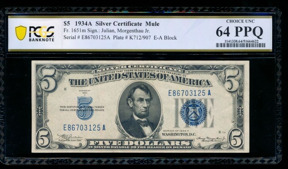 One 1934A $5 Silver Certificate PCGS 64PPQ.