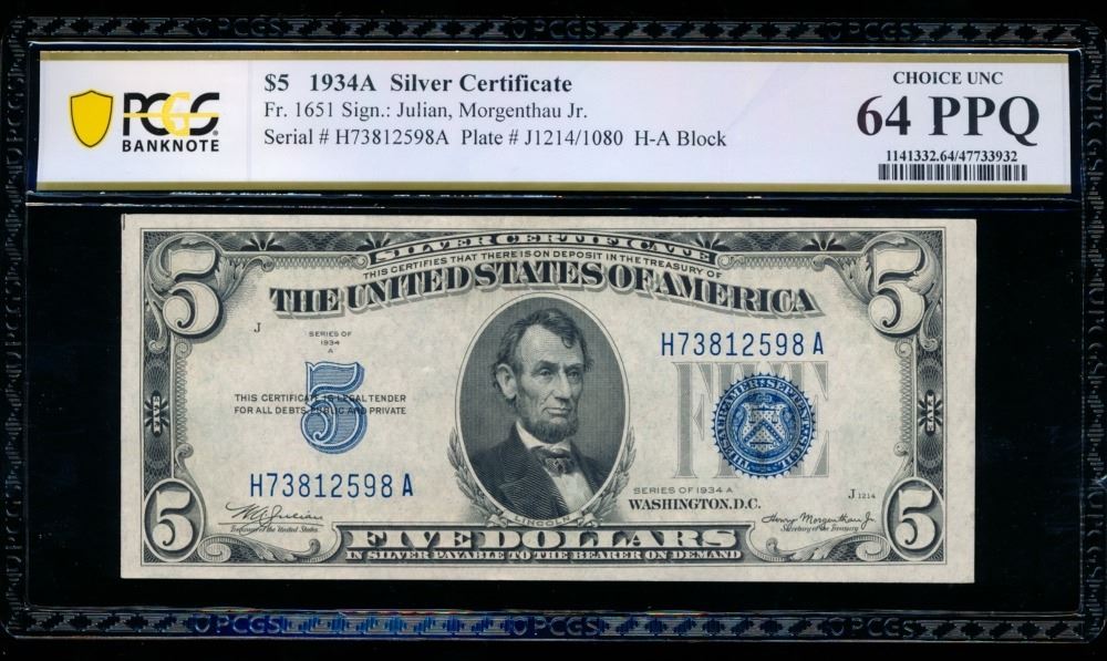 1934A $5 Silver Certificate PCGS 64PPQ