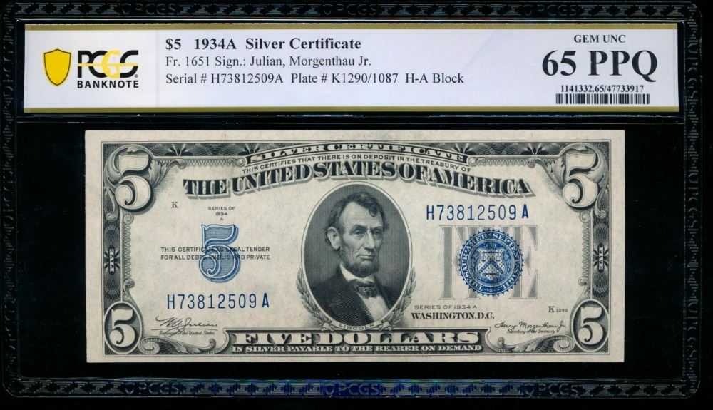 One 1934A $5 Silver Certificate PCGS 65PPQ.