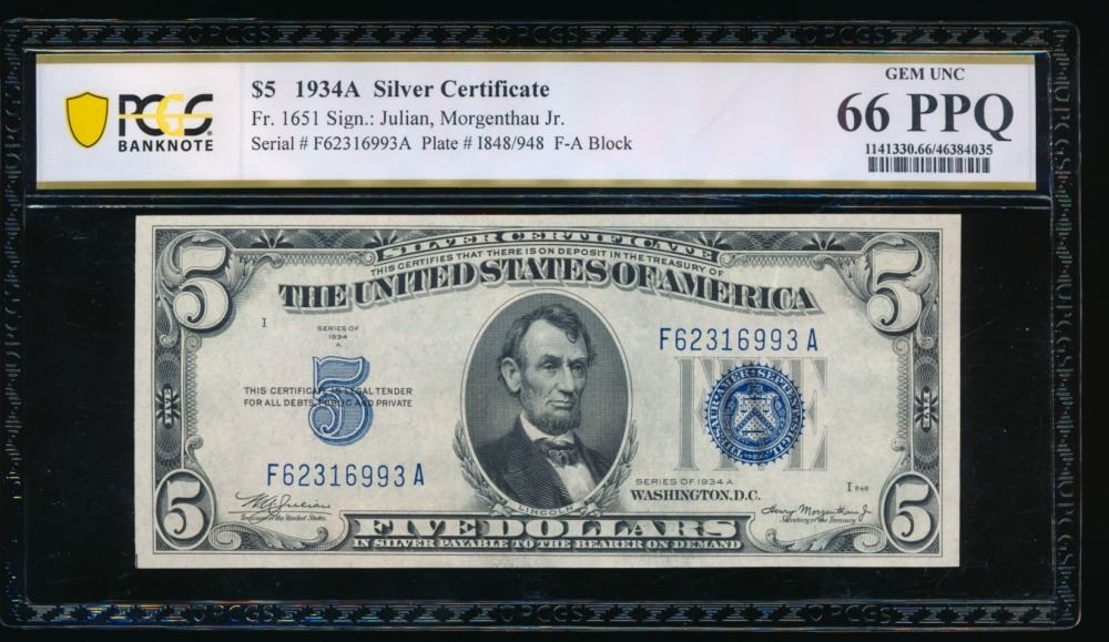 One 1934A $5 Silver Certificate PCGS 66PPQ.
