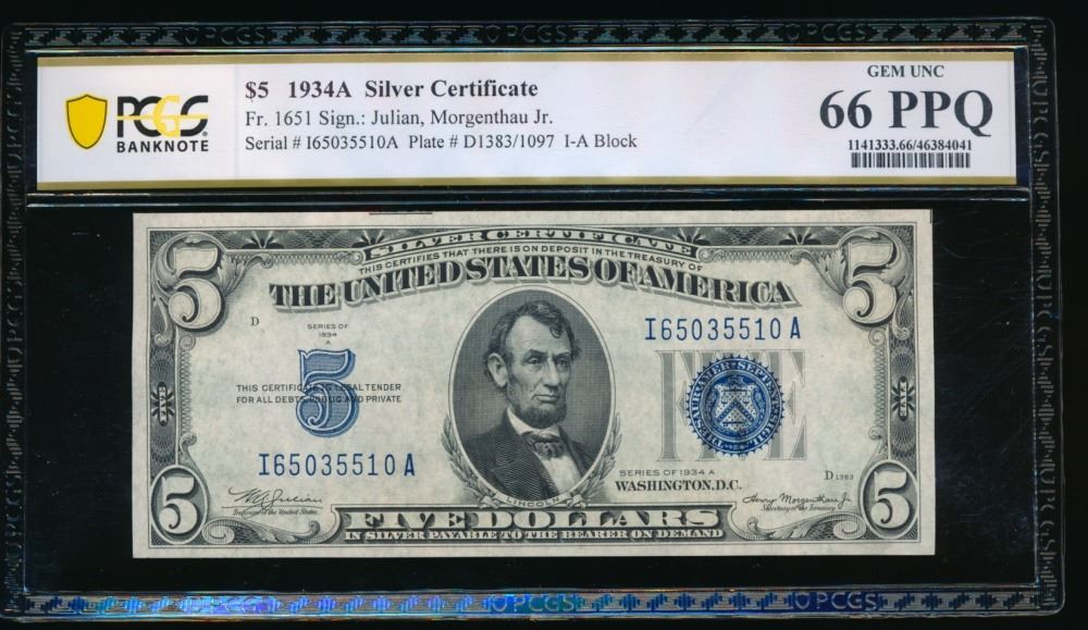 One 1934A $5 Silver Certificate PCGS 66PPQ.