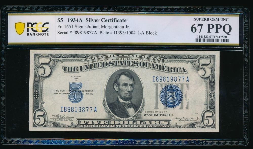 One 1934A $5 Silver Certificate PCGS 67PPQ.