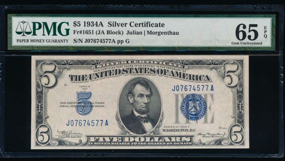 One 1934A $5 Silver Certificate PMG 65EPQ.