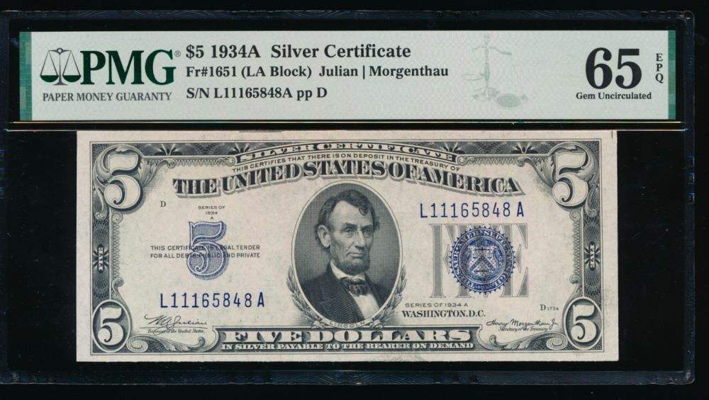 One 1934A $5 Silver Certificate PMG 65EPQ.