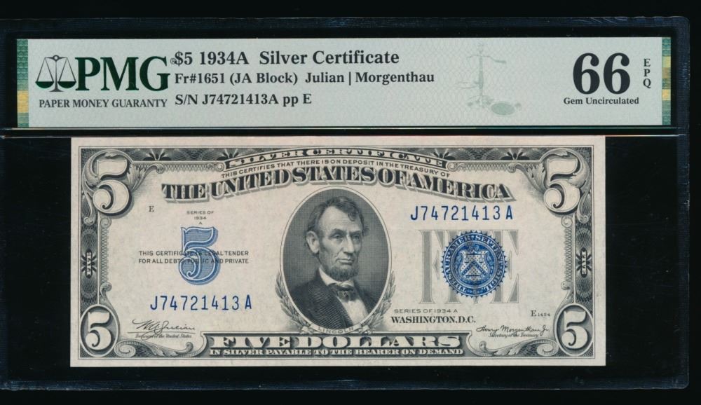 One 1934A $5 Silver Certificate PMG 66EPQ.