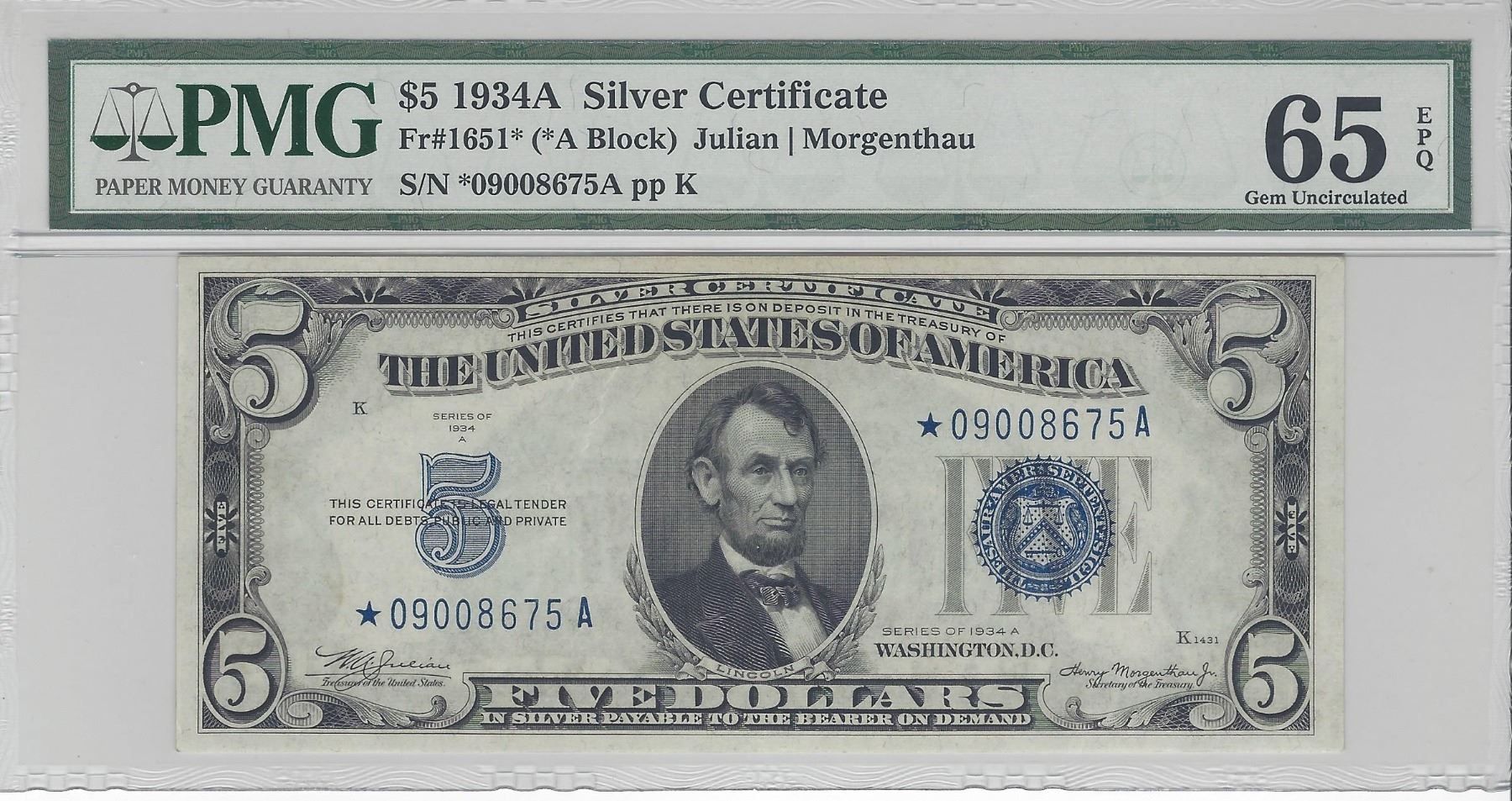 One 1934A $5 Silver Certificate STAR Note PMG 65EPQ.
