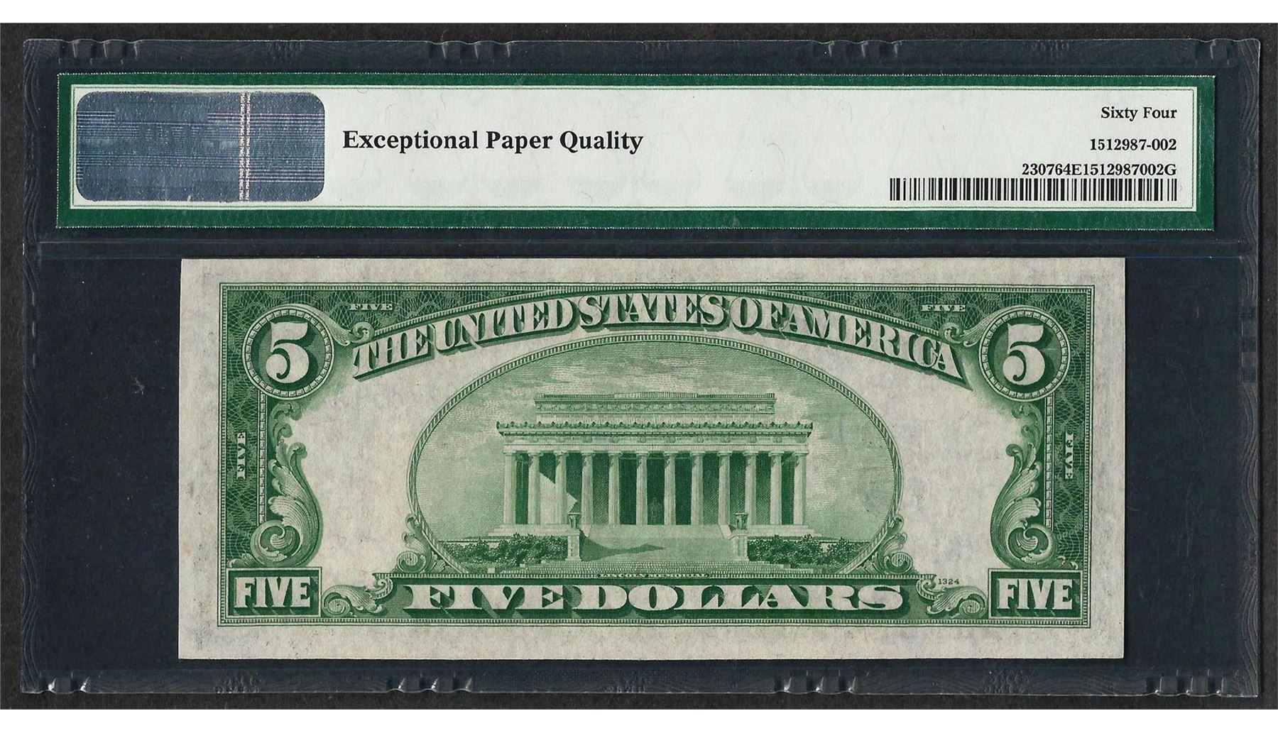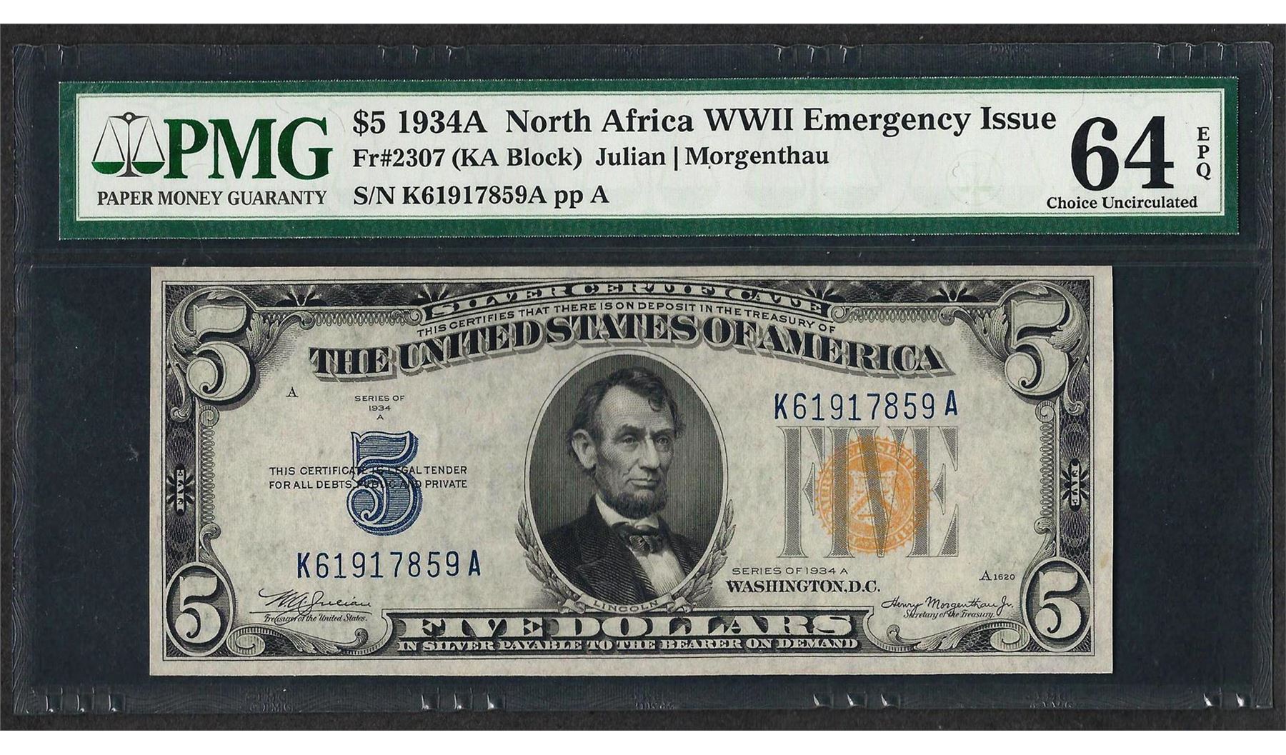 One 1934A $5 Silver Certificate WWII Emergency North Africa Note PMG Choice Unc. 64EPQ.