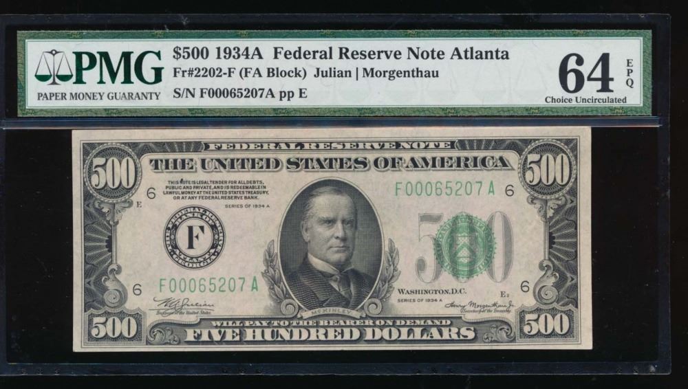 One 1934A $500 Atlanta Federal Reserve Note PMG 64EPQ.