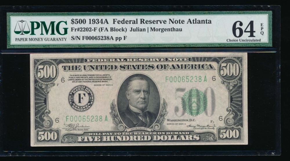 One 1934A $500 Atlanta Federal Reserve Note PMG 64EPQ.