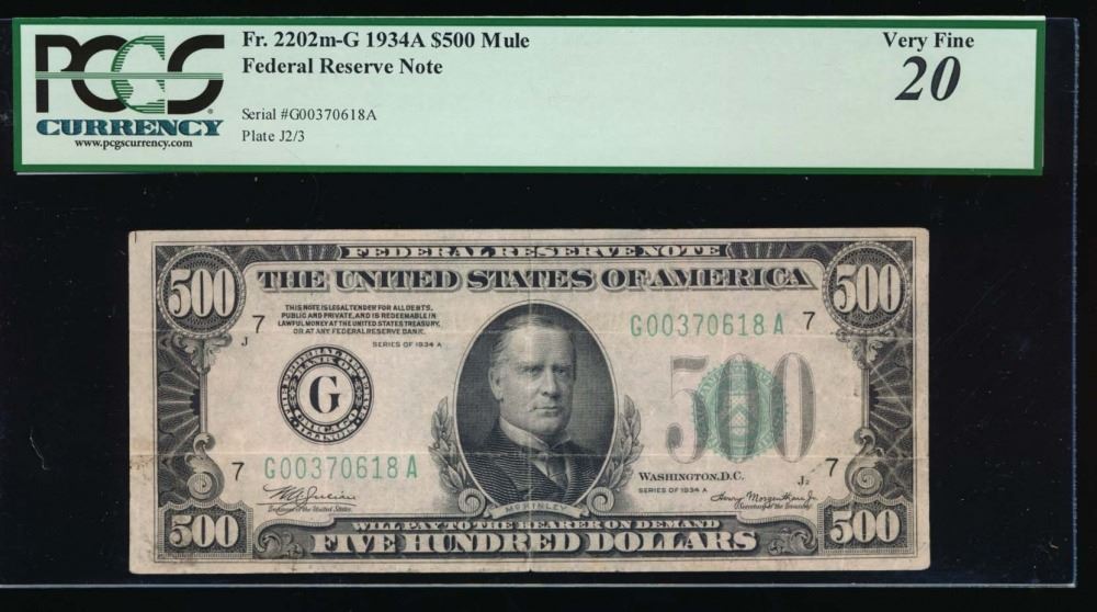 One 1934A $500 Chicago Federal Reserve Note PCGS 20.