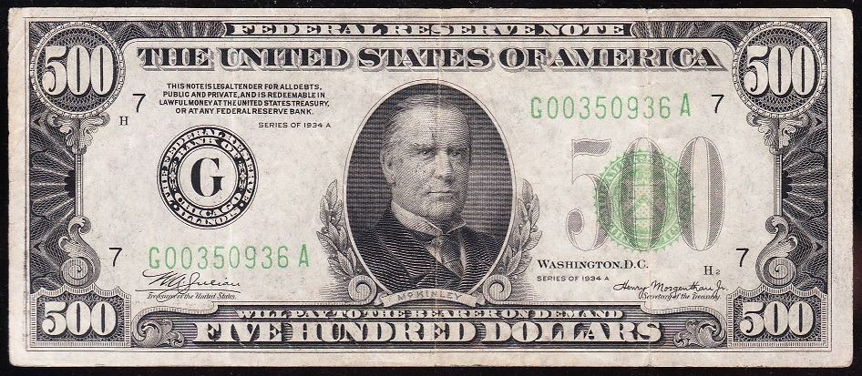 One 1934A $500 Chicago Federal Reserve Note.