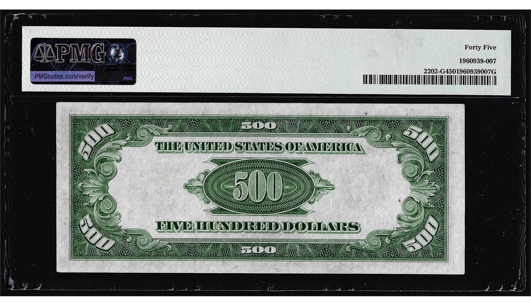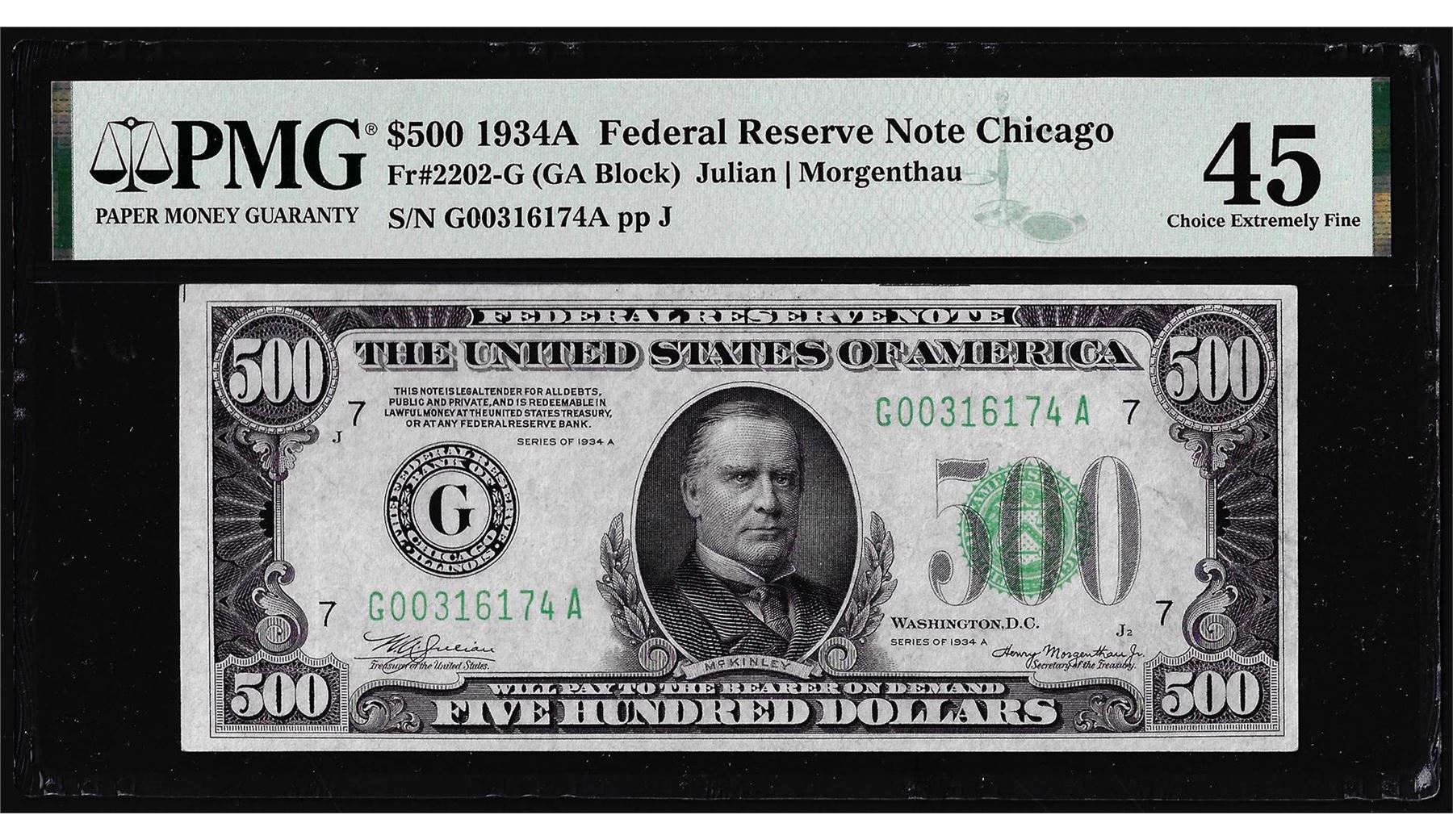 One 1934A $500 Federal Reserve Note Chicago Fr.2202-G PMG Choice Extremely Fine 45. PMG Certified.