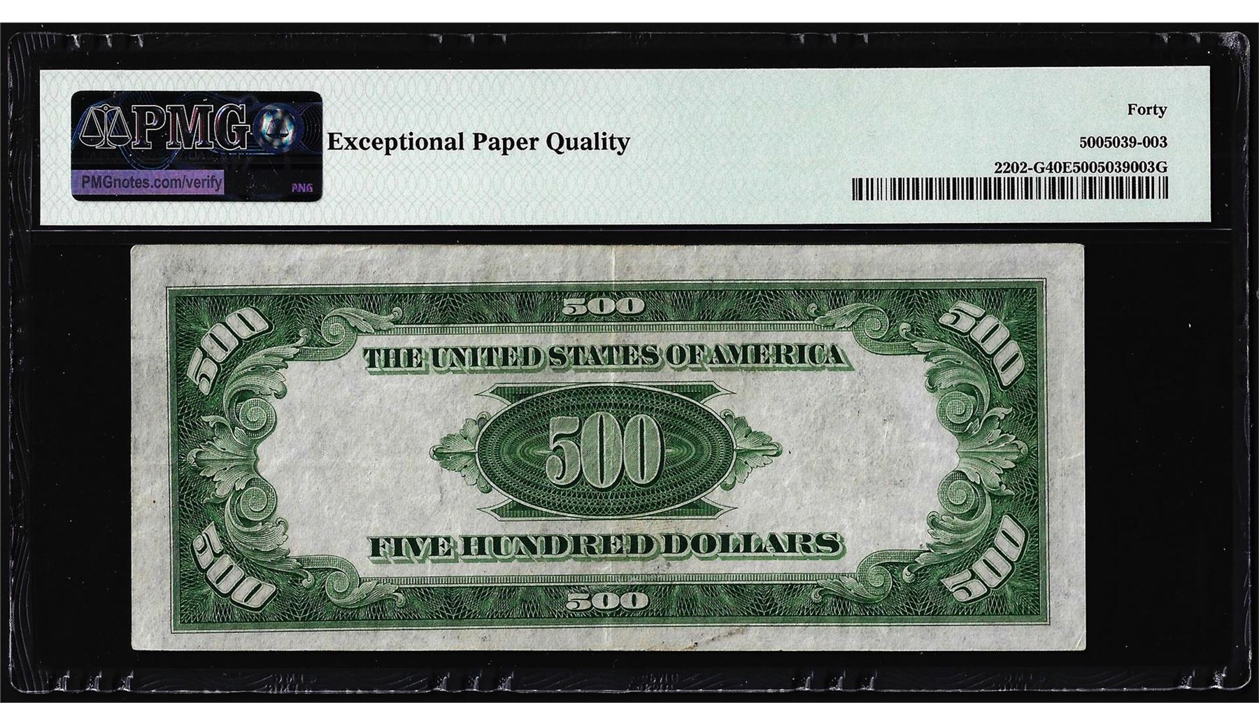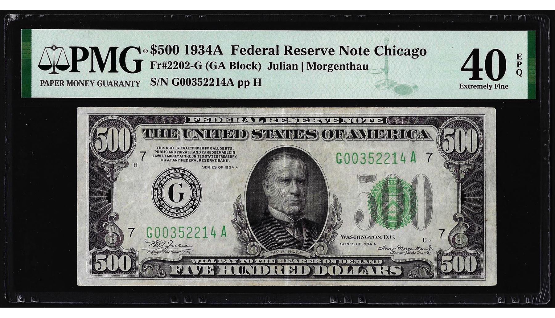 One 1934A $500 Federal Reserve Note Chicago Fr.2202-G PMG Extremely Fine 40EPQ. PMG Certified.