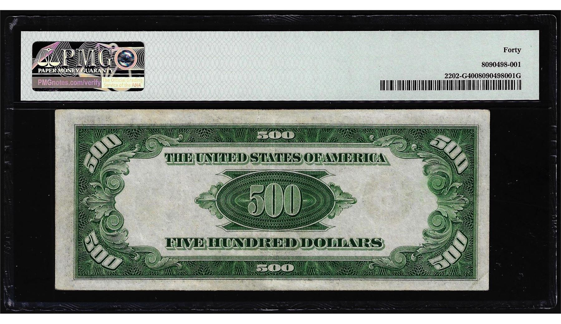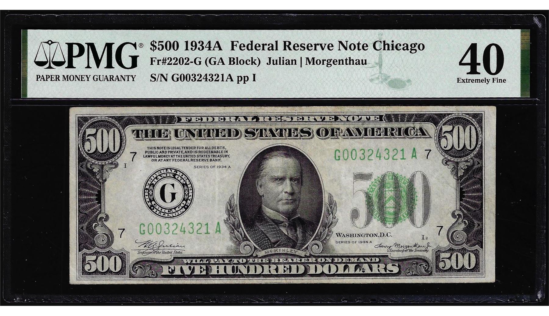 One 1934A $500 Federal Reserve Note Chicago Fr.2202-G PMG Extremely Fine 40. PMG Certified.
