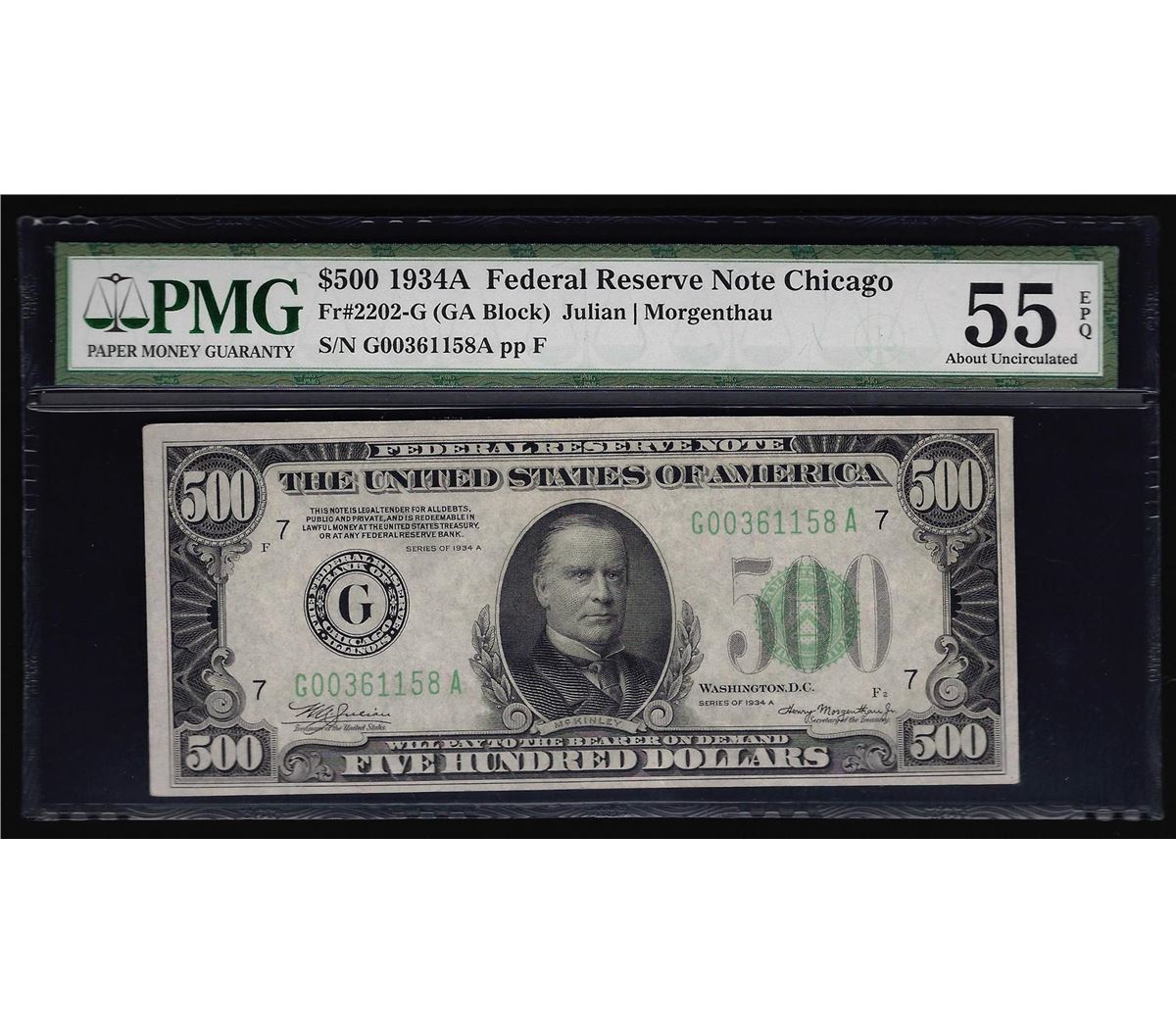 One 1934A $500 Federal Reserve Note Chicago PMG About Uncirculated 55EPQ. PMG Certified.