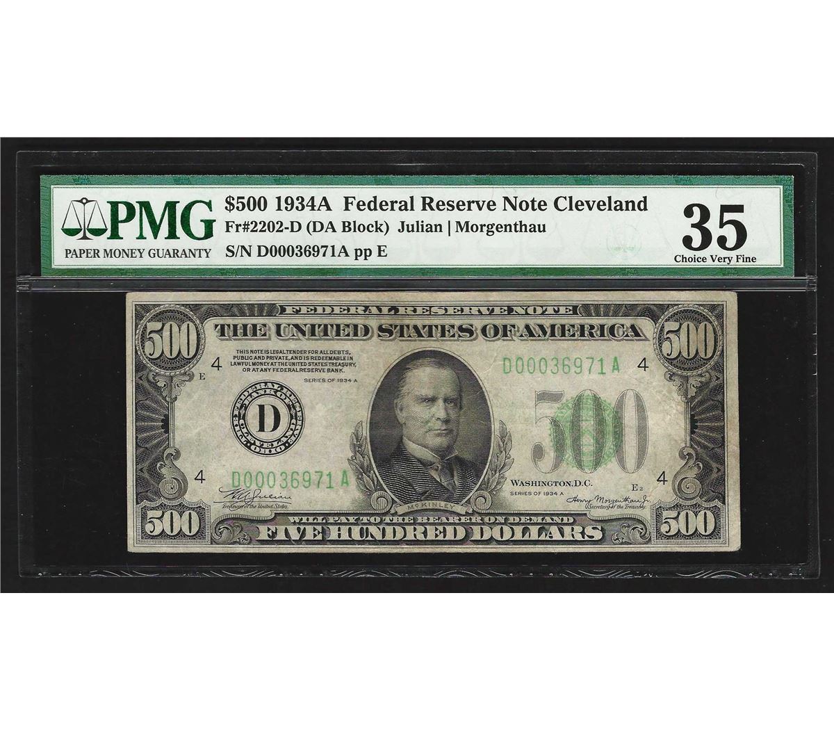 One 1934A $500 Federal Reserve Note Cleveland PMG Choice VF35. PMG Certified.