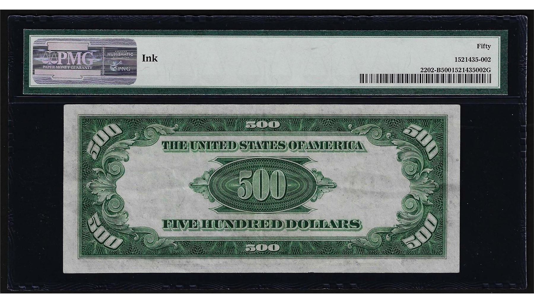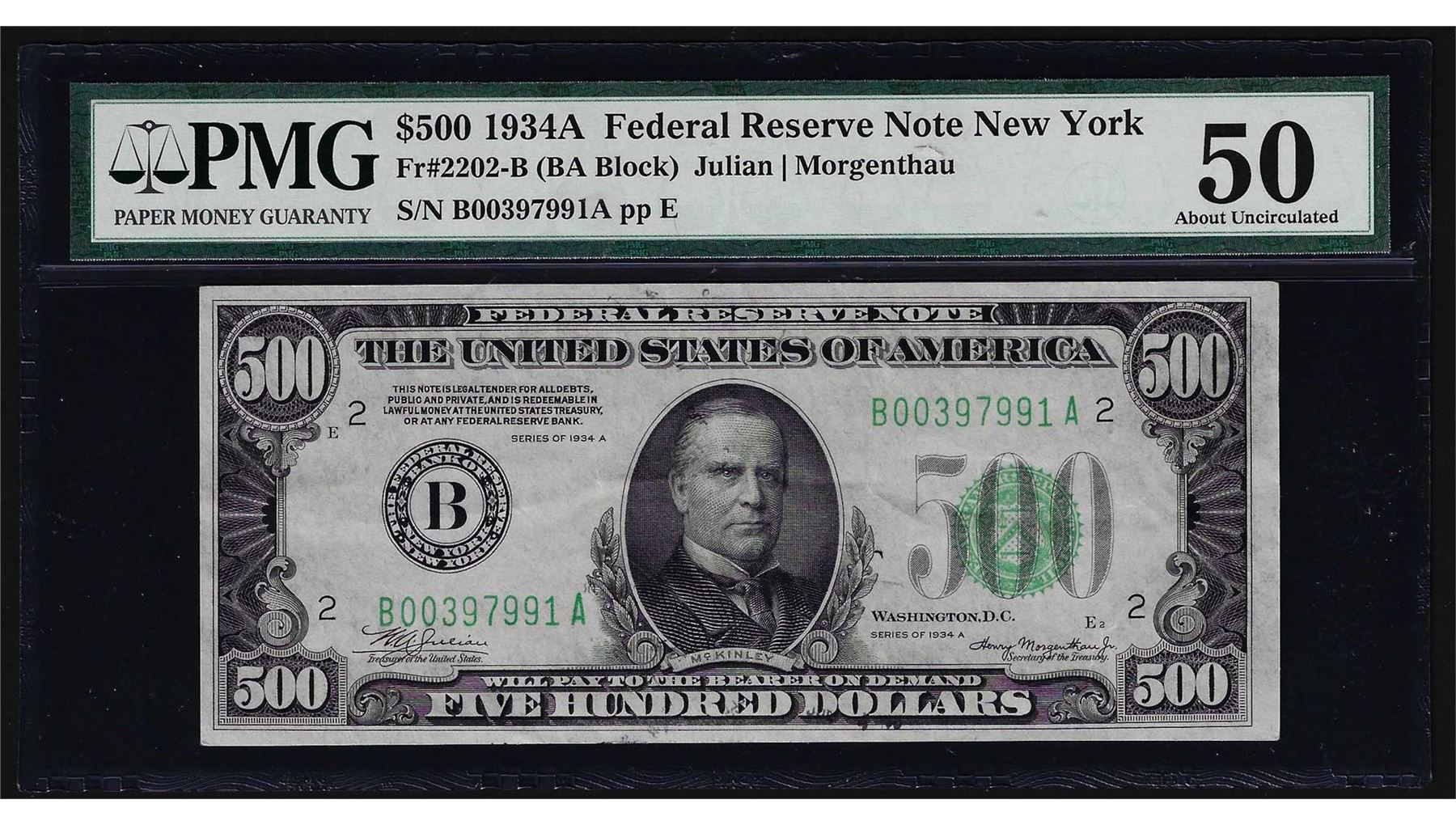 One 1934A $500 Federal Reserve Note New York Fr. 2202-B PMG About Uncirculated 50. PMG Certified.
