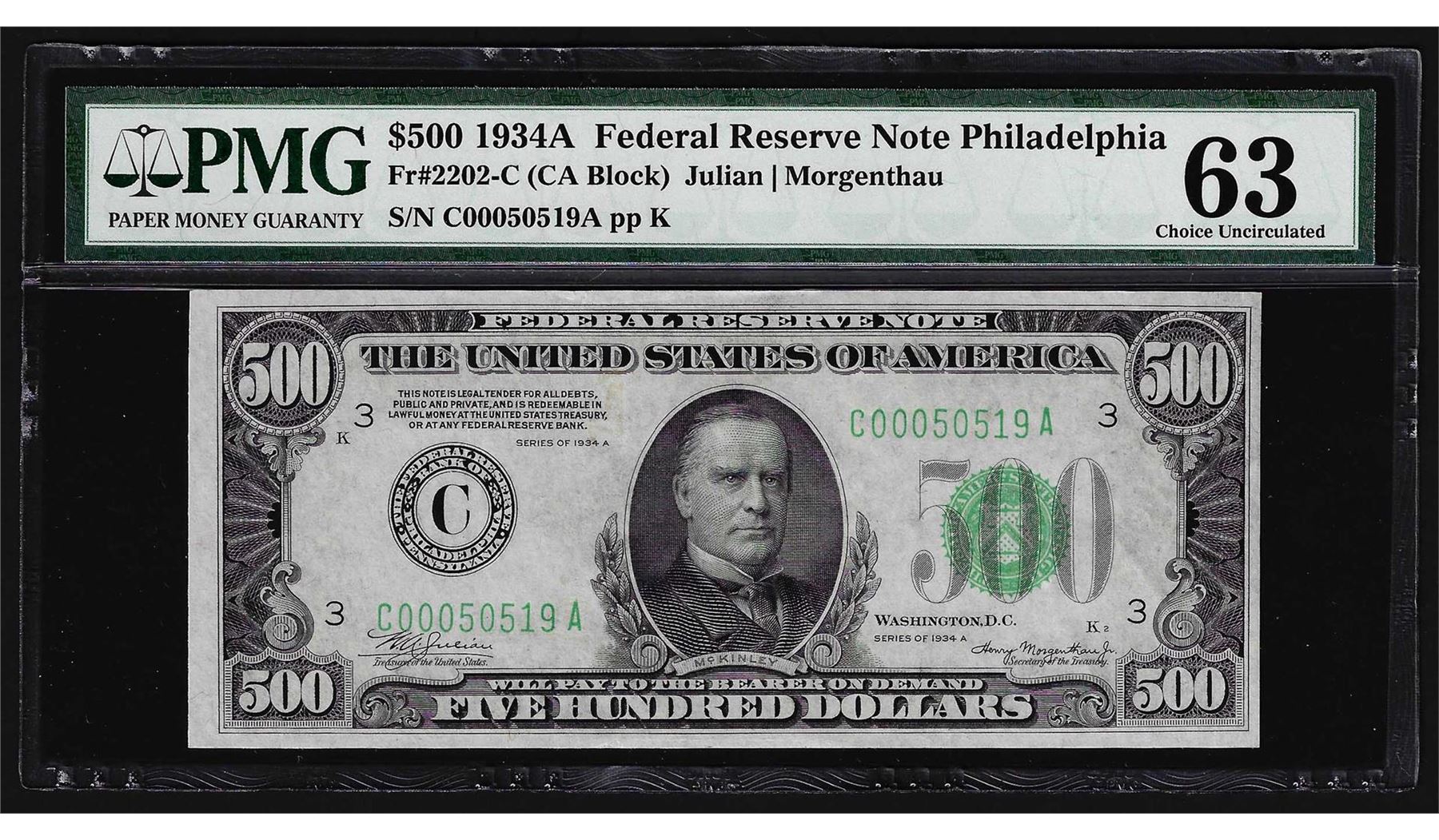 One 1934A $500 Federal Reserve Note Philadelphia PMG Choice Uncirculated 63. PMG Certified.
