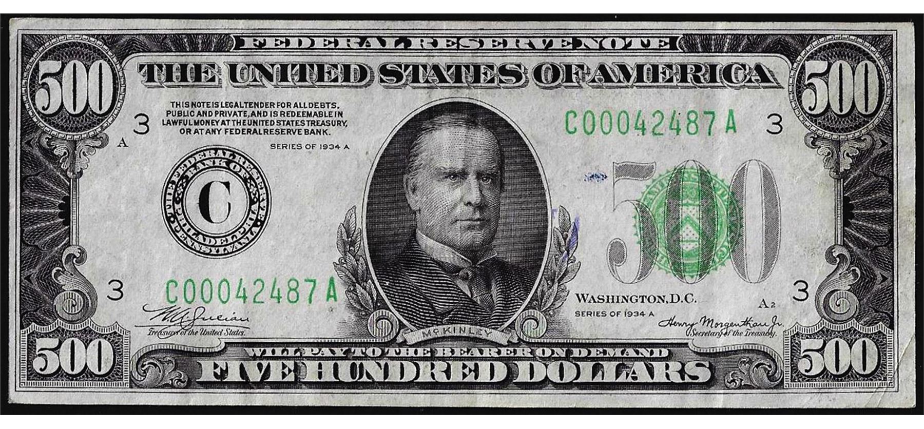One 1934A $500 Federal Reserve Note Philadelphia.