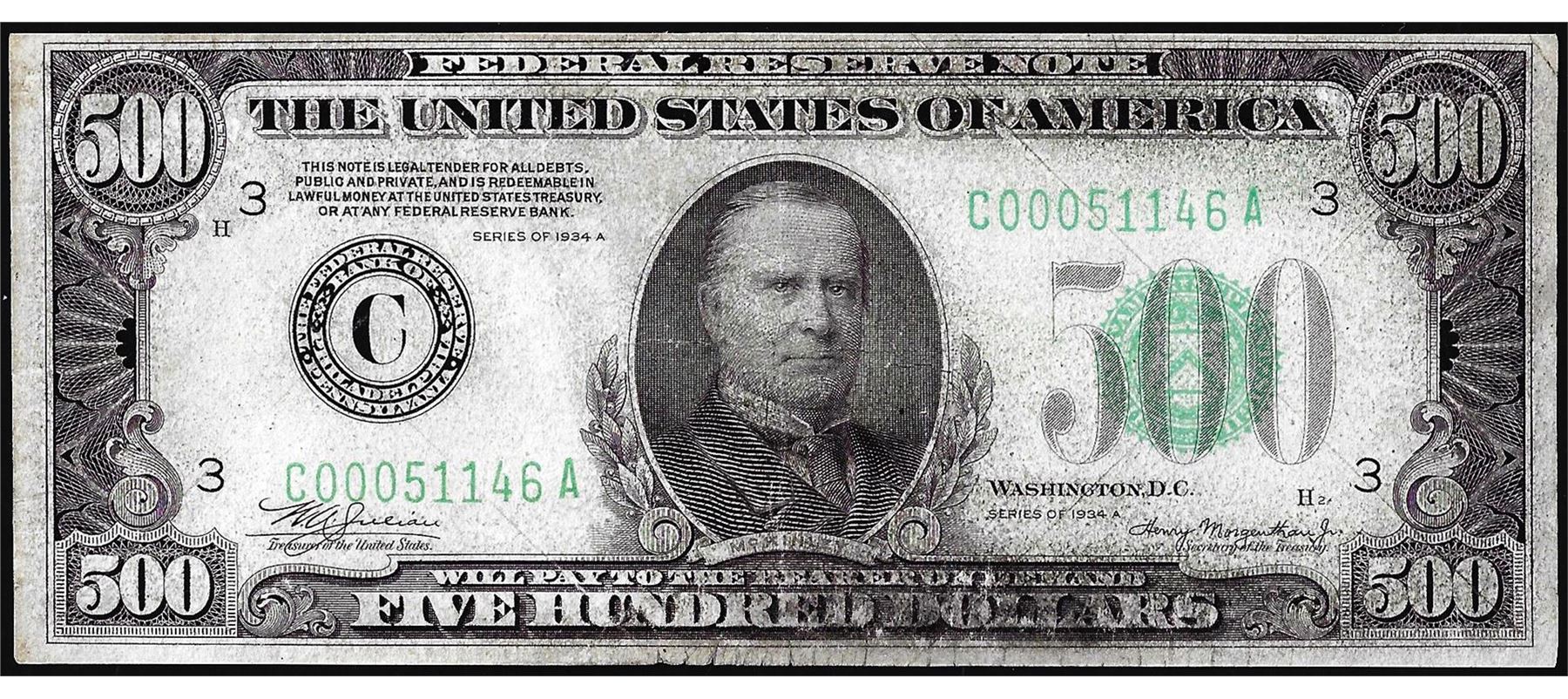 One 1934A $500 Federal Reserve Note Philadelphia.