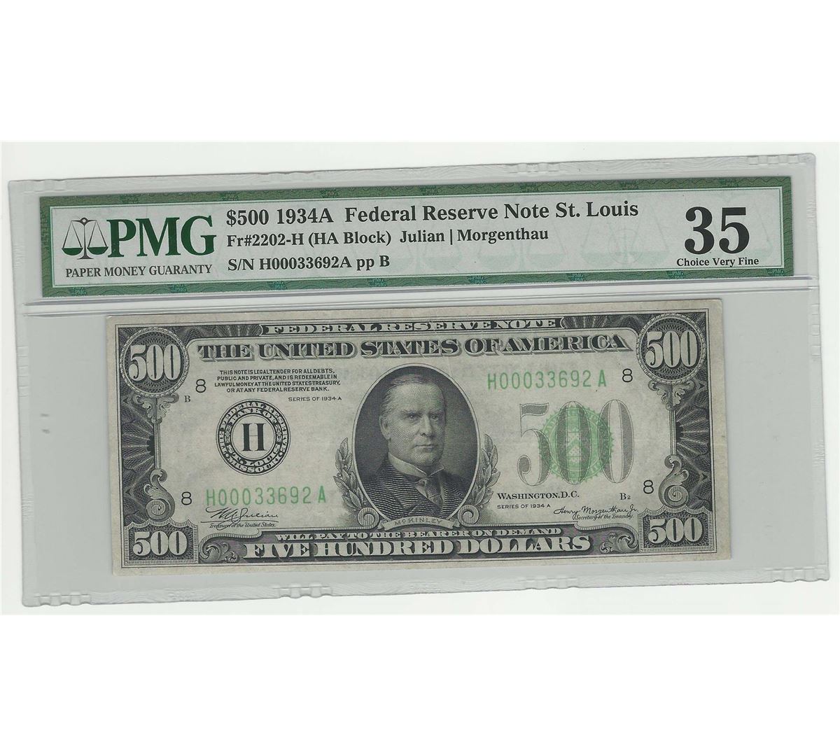 One 1934A $500 Federal Reserve Note St. Louis PMG Choice VF35. PMG Certified.