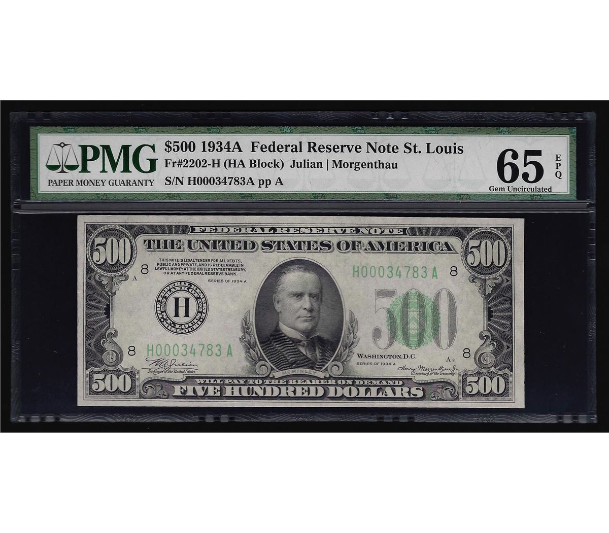 One 1934A $500 Federal Reserve Note St. Louis PMG Gem Uncirculated 65EPQ. PMG Certified.
