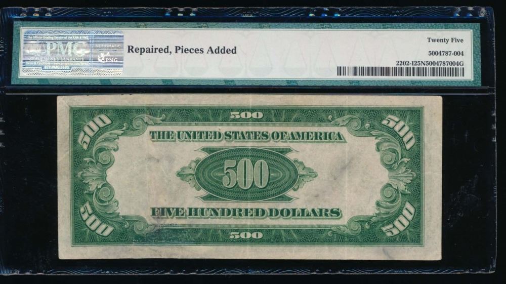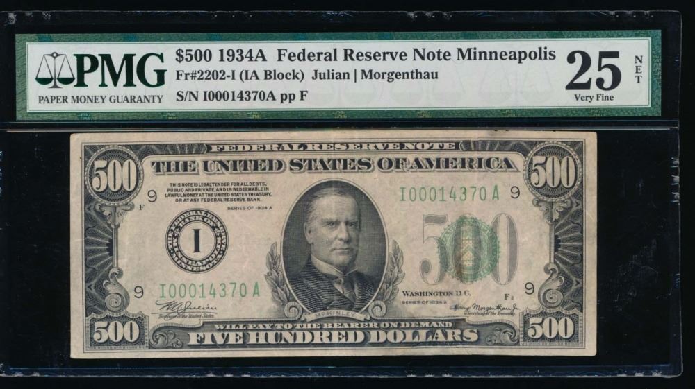 One 1934A $500 Minneapolis Federal Reserve Note PMG 25NET.
