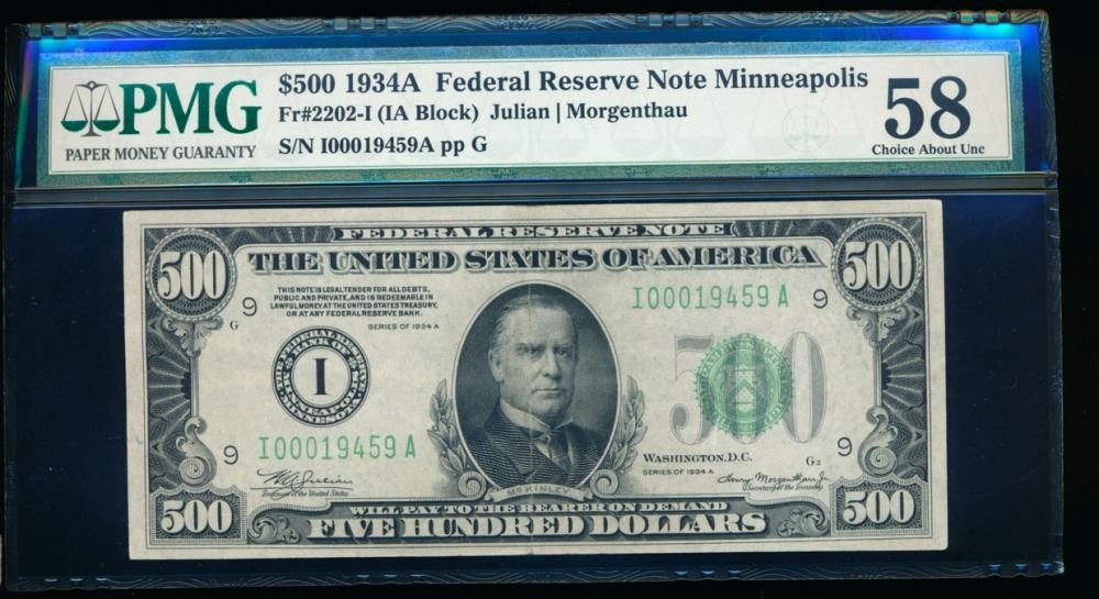 One 1934A $500 Minneapolis Federal Reserve Note PMG 58.