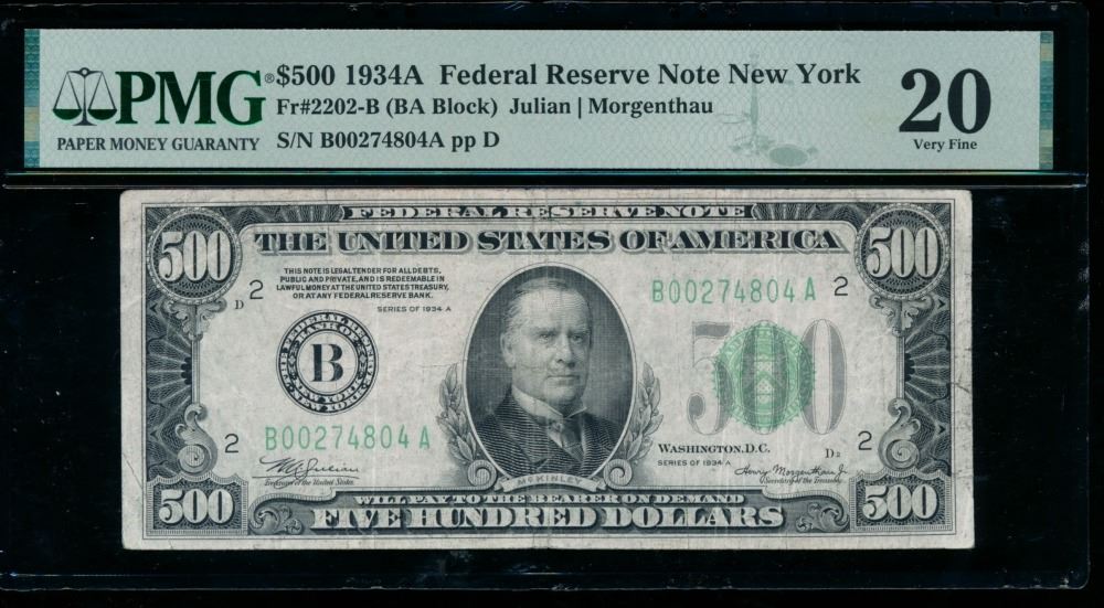 One 1934A $500 New York FRN PMG 20.