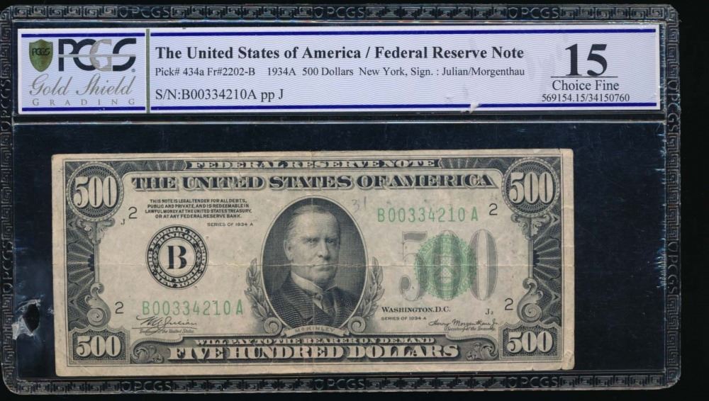One 1934A $500 New York Federal Reserve Note PCGS 15.