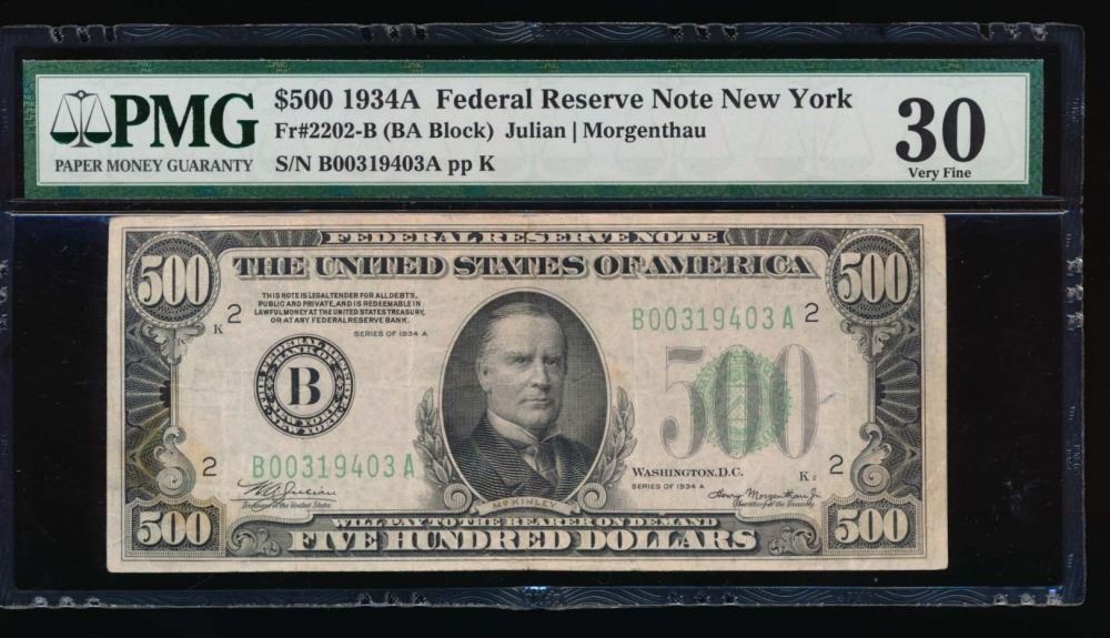 One 1934A $500 New York Federal Reserve Note PMG 30.