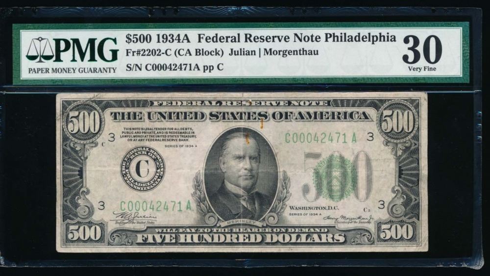 One 1934A $500 Philadelphia Federal Reserve Note PMG 30.