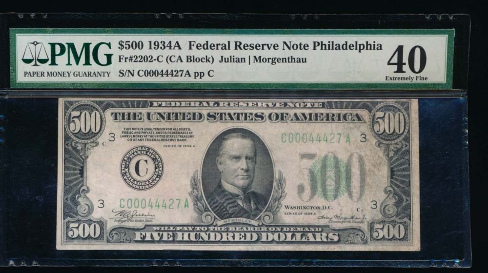One 1934A $500 Philadelphia Federal Reserve Note PMG 40.