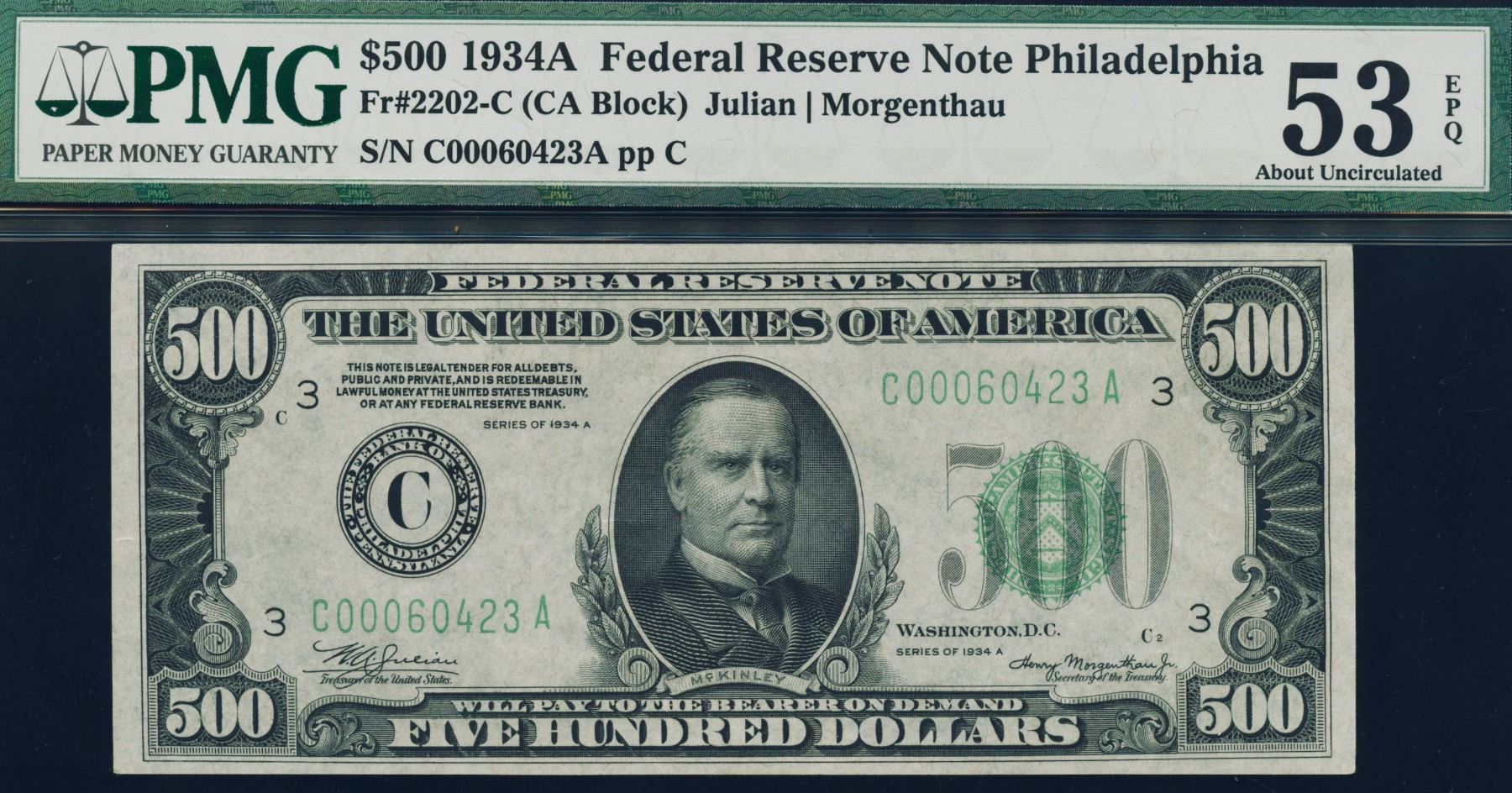One 1934A $500 Philadelphia Federal Reserve Note PMG 53EPQ.