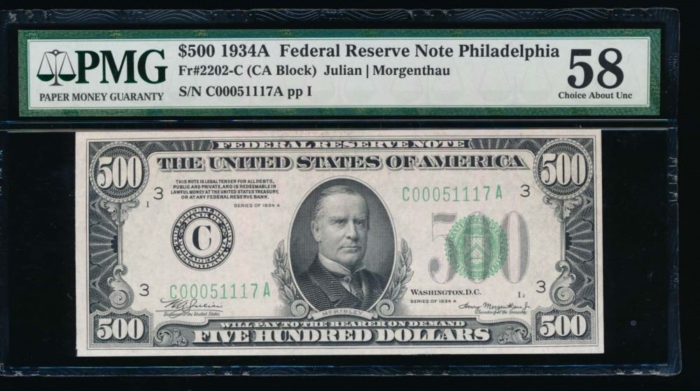One 1934A $500 Philadelphia Federal Reserve Note PMG 58.
